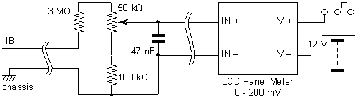 On the right is the display wired to the battery via a switch in the obvious way. On the left is the connection to the battery current sensor in the SMR and the car chassis. In the middle are some resistors that arrange for each 0.027 volts that the sensor outputs to register as one count (1 mV) on the panel meter. This makes the panel meter read in amps, with a resolution of 0.1 amps. (Click to read about how I figured out the value 0.027.) The capacitor, which I won't mention again, is intended to prevent the pick up of any electrical noise on the wire to the display. Before I added it, I occasionally got some odd readings. By using a potentiometer in this circuit, you can adjust the display to read correctly so you don't have to worry about the tolerance (error) of the resistor values. Just connect a known voltage of two or three volts instead of the sensor input and adjust the potentiometer until the display reads this voltage divided by 0.027. For example, if you apply 3.000 volts, adjust for a reading of 111.1. Actually, I needed this adjustability because at first I had only a rough idea what the division factor would turn out to be. You can dispense with this component if you use a 3.9 M resistor in place of the 3 M and a 150 k in place of the 100 k (because 150 / (3900 + 150) = 1 / 27). In this case, wire all three points where the 50 k potentiometer used to be together. Either use resistors with small tolerance, such as 1% or 2%, or perform a calibration as above using the potentiometer on the back of the panel meter. Of course, if you're not to worried about accuracy, you can use 5% resistors and take what you get, but in this case you should be cautious when exchanging data with others.
