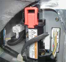 The battery current sensor signal passes from the SMR to the Battery ECU over a short solid yellow wire inside the trunk. The picture at right (click for a bigger version) shows the paraphernalia at the left side of the high voltage battery. To see it, you need to detach and lift up the felt covering in this area, which you can see being held aside in the top left of the picture. In the center is the orange service plug. To the right are the two connectors to the Battery ECU, which is inside the battery housing. To the left and somewhat further forward in the car is the single connector to the SMR.