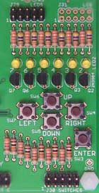 The Dragon Rider printed circuit board includes an area for six LED indicators and five push-button switches. 10-pin headers allow the LEDs and switches to be linked to target microcontroller ports with 10-way ribbon cables of the type supplied with the Atmel STK500. LEDs are numbered 2 to 7, corresponding to the port bits that control them. Switches are arranged in a diamond, labeled UP, DOWN, LEFT and RIGHT, with a fifth ENTER switch, for convenient use with menu-driven user interfaces. LEDs and switches can be controlled from the same port if desired.