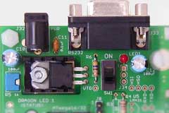 LED1 and R6 can be installed to provide a power ON indicator. Make sure that the anode of LED1 (usually the longer lead) is closer to the top of the board, near the DB9 connector, J33. If R6 is installed in the marked footprint, the LED will light when the unregulated power source is plugged in, whether or not SW1 is closed. If you have the Dragon Rider mounted on an AVR Dragon, this would be a good warning that you should be careful not to close SW1 and SW2 at the same time. To have LED1 light when target power is active, either from the power supply add-on via SW1 or from the AVR Dragon via SW2, stretch R6 so that the lower lead goes to the pad marked VTG. You can do this even if you don't assemble the rest of the power supply add-on circuit, just to get a power ON indicator for the target circuit.
