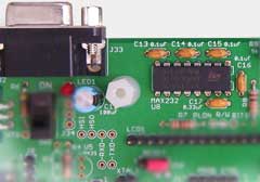 The Dragon Rider printed circuit board includes an area for a serial (COM port) interface, with level converters and a board-mounted female DE9 connector. Using this, the target microcontroller can be linked to a PC, terminal, modem or to other systems for control, monitoring and logging. A no-compromise design allows data rates up to the highest supported by the target and the cable or data transmission system.