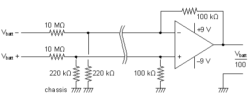 The high-voltage battery is not connected to the car chassis at either end (or anywhere else). I need to measure the difference in voltage between the two battery terminals, not the voltage of one terminal with respect to chassis. Although the LabJack data acquisition unit has differential inputs, for reasons explained below I need to pass the voltage signal through a low-pass filter before applying it to the LabJack. So, I need my own differential amplifier circuit to convert the battery terminal voltage difference to a "single-ended" signal with respect to the car chassis. The built-in current sensor outputs a voltage with respect to the car chassis. Therefore, my signal conditioning circuitry, the LabJack and the attached computer use the chassis connection as their "ground" potential. This is why the voltage signal must also be referenced to chassis.