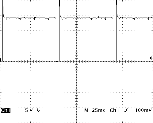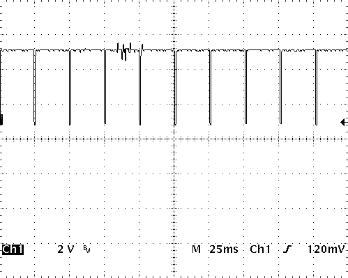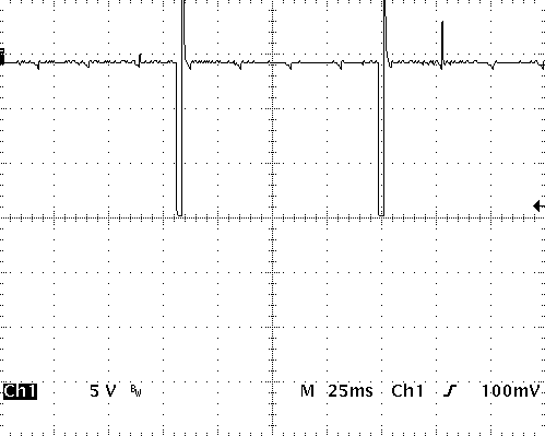 The Engine ECU sends a signal to each of the four igniters and a fifth signal to all four together. I took a trace from igniter 1, the signals to the other three being similar. You can see that the pulse period is about 91 ms. This indicates that the engine was running at about 1320 r.p.m. (there is one pulse at each injector per two crankshaft revolutions). The signal inactive level is close to zero volts and positive going pulses to about four volts appear to be the command to fire the igniter. The pulse width is about 2.5 ms. I also took a trace from the signal to all igniters. Here, the inactive level is a little over 5 volts, perhaps the supply voltage of some logic circuits. Negative going pulses to about 0.8 volts appear to be the firing commands. These pulses are much narrower than the individual igniter signals at around 1 ms. Their period is a little more than 25 ms, indicating that the engine was then running at just over 1200 r.p.m. I am led to believe that people have used this all-igniter signal as the input to a tachometer.