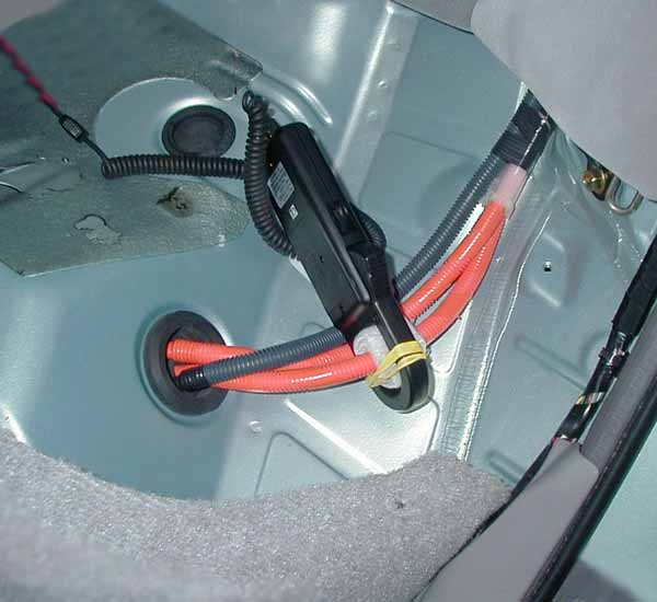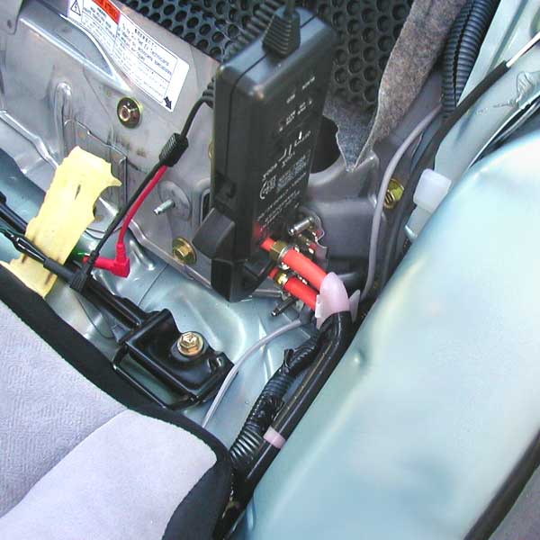The picture at right (click it for a bigger version) shows the attachment of the current probe to the battery cables as they pass under the rear seat on the left side of the car. You are looking through the left side rear door to where the seat used to be before I took it out. The first thing, then, is to take out the rear seat bottom.