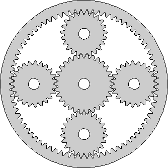 The central component of the Prius transmission is an epicyclic gear that Toyota calls the "Power Split Device" (PSD). This type of gear is also known as "sun-and-planets" because it consists of a number of "planet" gears surrounding a central "sun" gear. The planet gears are on shafts fixed to a "planet carrier", which revolves around the same axis as the sun. Unlike real planets, they are all the same size and all the same distance from the common center of rotation. The planet gears are surrounded by and mesh with an inside-out gear called the "ring". This also revolves around the same axis as everything else. Click on the diagram at right to get a closer look.