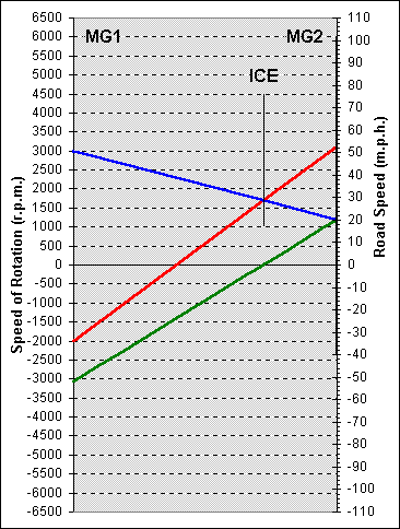The green line represents the situation when the car is moving at 20 m.p.h. and the ICE is stationary. The rotation rate of MG2 and MG1 can be read off as about 1200 and -3100 r.p.m. respectively. The blue line shows what happens if MG1 changes direction and starts the ICE, which then runs at 1700 r.p.m. MG1 will spin forwards at 3000 r.p.m. The red line shows that for the same ICE rotation rate of 1700 r.p.m., the car can reach a speed of 52 m.p.h. if MG1 spins backwards at 2000 r.p.m. At this road speed, MG2 will spin at about 3100 r.p.m.