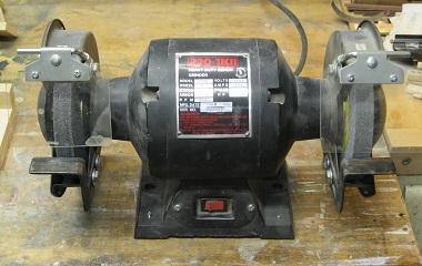 Bench Grinder![]() I have a ProTech "Heavy Duty" bench grinder which I bought decades ago to sharpen things like lawnmower blades and masonry chisels. The label gives the date of manufacture as 1989, the speed as 3,500 r.p.m. and the power as ½ horsepower. It uses 6" diameter, ¾" wide grinding wheels with an ½" arbor (the spindle isn't long enough to take a wider wheel). It came with dark grey aluminum oxide wheels, 36 grit on the left and 60 grit (marked A60Q) on the right. The coarse wheel is now in bad shape but the fine wheel is pretty good. Home Depot carry PowerTec brand grinding wheels in 80, 100 and 150 grits for $18.97. They also sell silicon carbide wheels, but that doesn't seem the best choice for tool steel. Norton make a White Aluminum Oxide Grinding Wheel that they claim keeps the tool cooler. These are available from (for example) SharpeningSupplies.com.