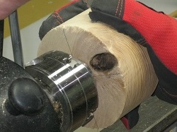 ![]() ![]() January 19th, 2024 - The Knotty White Ash BlankThis blank is up next, while my expectations are still low, because of a large knot. This is at the edge of one face and slopes toward the center. I've oriented the blank so that this will be on the top. I'll have to remove material from the top face until I have a clean upper edge and then my hope is that hollowing out the bowl will just disappear the rest of the knot. The first picture, at right, shows me putting the blank on the lathe using the worm screw in preparation for starting work on the bottom. Then I will turn the piece and deal with the knot on the top. I've not worked with white ash before, so I checked it out at the Wood Database. I read "Produces good results with hand or machine tools ... finishes well". Good! From the 4" square, 2" thick blank, I got a 3¾" diameter 1½" tall bowl.