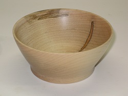 ![]() February 29th, 2024 - The Fourth Ambrosia Maple BlankNow there are three blanks of this wood left. I don't see much to choose between them, so I'll work through them to gain practice. I'll stop agonizing over tears in the soft parts of the wood because they're not that noticeable in the finished bowl and fit in with the overall "damaged" appearance. No more trying to plug them with glue and sawdust. With some scraping (using the wings of the bowl gouge on the outside and my skewchigouge on the inside) I can reduce sanding to an acceptable level. I experimented with "twice turning", which should relieve any stress in the wood and allow it to dry out if necessary. This is in reaction to the pau rosa bowl that "moved" after the outside was turned, see above. All I did was to flip the bowl before the outer profile was fully developed and rough out the inside. This did not work. When I flipped the bowl back, it was running on a very different axis. The "spigot" remaining after I begin hollowing does not provide the support of the original top face. Maybe it would on a bigger bowl if I left a spigot as large as the screw chuck. To rescue this bowl, I finished the outer profile while the chuck held it by the mortise / recess. This required scraping, as I've not figured out the pull cut. The appearance of the finished bowl is different from the earlier ones, having bands of darker wood. There's also more evidence of the beetle at work on this particular bowl with a sizeable "living space" right at the edge. To change things up a bit, I decorated the outside edge with V-cuts.