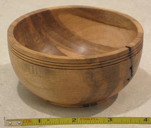 ![]() January 22nd, 2024 - The Middle Spalted Maple BlankThose spalted maple blanks were calling to me. Wood that I felled in my own back yard, seasoned, spalted (accidentally) and milled! I quickly discovered that parts that are significantly decayed are a liability and won't finish cleanly. I could have figured that out if I'd thought about it. I got a 5" diameter 1¾" tall bowl.