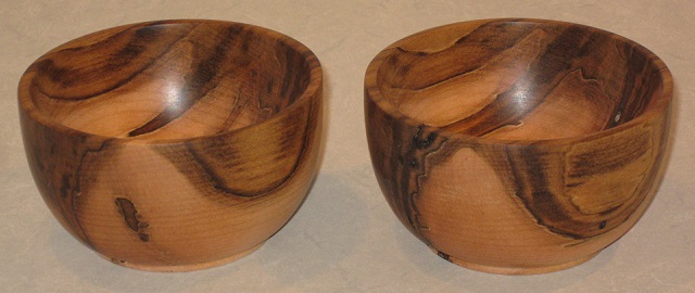 ![]() March 9th to 11th, 2024 — The Fifth and Sixth Ambrosia Maple Blanks - Litter-Mates!When people see my growing collection of bowls it’s not unusual for them to express an interest in the process of making them. Some friends were visiting when I had one of the last two ambrosia maple blanks on the lathe and they watched while I made a couple of push cuts on the inside. The question then came up - how long does it take to make a bowl? I’d not paid attention to this and couldn’t answer. So, I completed the one on the lathe and made the estimate of three hours. Toying with this bowl and the last blank, someone noted similarities in the pattern and we realized that the two blanks had been next to each other in the tree. So, we called them “twins” and then “litter mates” and I set about turning the second bowl to be the same shape as the first, to the best of my ability. Here they are in the picture at right. And, yes, it’s probable that the fourth ambrosia maple bowl, above, also came from close by in the same tree. I didn’t come across any new problems. I worked slowly to minimize tears in the soft parts of the wood and fixed them up as best I can with scraping and sanding. I am starting to think that I should buy a real scraper tool, probably a small round-point scraper which I will then grind to a French curve.