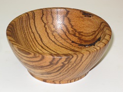![]() January 15th, 2024 - The First Zebrawood BlankStill with modest expectations, I picked Zebrawood for my next try as it was cheap and I have three pieces. The Wood Database says that Zebrawood "... can be very difficult to plane or surface due to the prevalence of interlocking grain" and warns "Tearout is common". I picked the worst piece, with some kind of weird defect, and I won't mind throwing it out. I had similar difficulties to my first try. Getting a decent surface on the bottom of the bowl was just not working. However, when things went wrong they didn't go as disastrously wrong. Except for one serious catch, I was just trying over and over again and not getting it right. Again, I eventually rescued myself with spindle tools (which is OK on the top and bottom faces of a bowl). Working around the side of the bowl with a push cut was juddering and leaving a rough surface. I realized that I should be sharpening the gouge more often. Things then went rather better. Hollowing the inside worked fairly well and I got a more pleasing curve to the walls. I'm definitely limited in how steep I can make the walls by the bevel angle of my gouge. I should at least see what it is and maybe grind it differently. After sanding and finishing, the only really visible flaw is a ring where the inside walls of the bowl rather sharply transition to the flatish bottom. From this 4" square, 2" thick blank, I got a 3¾" diameter 1½" tall bowl.