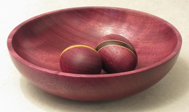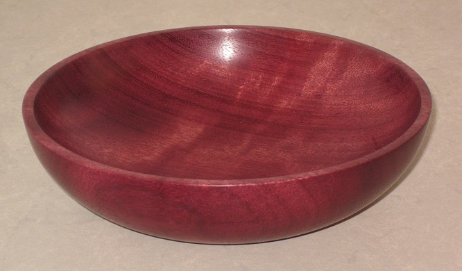 ![]() March 26th, 2024 — The Purpleheart BlankI bought this blank with the specific goal of making a gift for a friend. She is very fond of the color purple. Now, purpleheart is 50% denser than black walnut (905 kg/m3 vs 610 kg/m3) and twice to three times as hard (Janka 11,190 N vs. 4,490 N). The Wood Database warns “Working with purpleheart can present some unique challenges” and I’ve found this to be true. But, it finishes to a lovely smooth surface. I feel I’m now ready for this challenge. Turning the outside was similar to the walnut blanks, maybe a bit more prone to tear-out and less prone to tool chatter. Turning the inside was about as difficult as the America black walnut, above. The slightly greater diameter meant that the rim was further from the point of support and the buzzing was more like a screech. I gave up trying to get a smooth surface from the gouge before the wall of the bowl became too thin and switched to scraping. (If I’d known that the scraper I ordered would arrive the next day, I would have held off!) Then, lots of sanding. For this I reduced the speed and it seemed to go better. I’m very, very happy with the result (6⅝” diameter by 1¾” tall). I could see figure in the blank, but I don’t know how to predict whether it will appear in the finished bowl. Well, it did. As it catches light from different directions, the appearance changes (this is called chatoyance).