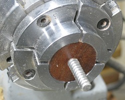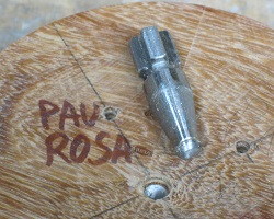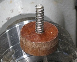 ![]() ![]() ![]() There are three ways around this little problem. I can try to get a replacement worm screw, but that will take weeks. I can go back to eBay and get a dedicated (and perhaps better made) screw chuck for about twenty-five dollars and that will take four days to a week. I can try making a screw chuck and be back in business tomorrow. I found a sturdy, stainless steel, number 12 sheet metal screw. Number 14 would be better, but this will do. I found a scrap of curupay, which is even harder than pau rosa. I glued this to a piece of maple mounted in the chuck jaws. Then I carefully turned the curupay to a disk, tapering slightly and one inch diameter at the small end. I drilled it to take the screw (using a drill chuck in the tailstock) and also drilled and squared up a recess for the screw head. Then I parted it off at a thickness very slightly less than the depth of the chuck jaws. I put epoxy on the screw, ran it in firmly and put it in a warm oven to set. Then I ground off the point, shortening it to three-quarters of an inch. Mounted in the chuck, pressed hard against the back of the jaws and gripped by the taper, this looks pretty much the same as the broken worm screw. With a smaller thread, mounting the blanks is a lot easier, but, to my surprise, it seems to hold just fine, even to turn the second pau rosa blank to round (lower left in photo)! The lesson learned is that I was drilling too small a hole in the blank and putting too much effort into screwing it onto the chuck. Going forward, I will use the same hole size for softer woods such as cherry and walnut, but a slightly bigger hole with an easier fit for hard maple and harder woods.