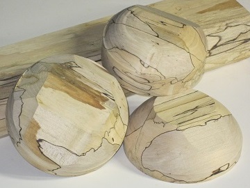 ![]() January 18th, 2024 - Blanks from Spalted Maple from Our Own Back YardMany years ago, I felled a 43-foot Norway maple in our back yard single-handed. OK, it was rather spindly, but even so. There was only one point where I wondered how long I would be hanging upside-down from my safety ropes waiting for someone to come by and call an ambulance. Most of the wood I cut into logs which I later split and that was our firewood. But, about four feet of the main trunk lay forgotten until I decided to clear up that part of the yard several years later. I got the chainsaw out and set about cutting it into more firewood, but I stopped when I saw that the wood had become spalted. I'd become interested in woodworking, so I knew what I was looking at and saved the parts that were not soft, milling it into pieces as best I could. But, I couldn't figure out quite what to make from it. I was into keepsake boxes at the time, using bookmatching techniques to get continuous grain around all four sides. In the end, I put the maple to one side. But now it's obvious. I can make bowls! Today I cut one piece into three blanks about five inches square and two inches thick. As you can see from the picture at right, I got carried away and started roughing out the bowls. But, I then stopped myself and got back to my original plan.