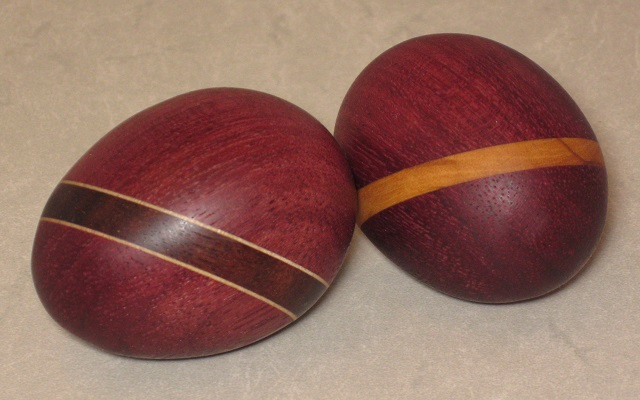 ![]() ![]() March 27th, 2024 — I Couldn't Throw Away the CornersThe blank for the purpleheart bowl was square. As I describe elsewhere, my first step for square blanks is to saw the corners off to make octagons, which are less scary spinning on the lathe. So I had these little triangles of a nice wood and couldn’t throw them away. My first though was ... wine bottle stoppers! If I glued them together in pairs, they make 1¾” cubes, which are a bit too short. So, I selected some scraps and glued these in as accents to get a length of about 2¼”. Somewhere along the line I decided instead to make them into eggs and to give them along with the bowl. Turning the eggs wasn’t easy, but it was great practice for critical control of a spindle profile and, in retrospect, a bit of fun. The accent woods were olive, granadillo and black maple veneer, chosen for no better reason than being in my scrap pile. The eggs are 1⅞” long by 1½” diameter (as compared to large chicken eggs from the fridge which are 2⅛” long by 1⅝” diameter).