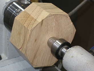 8 — Make sure that the worm screw is tight in the chuck and the blank is tight up against the chuck. Bring up the tailstock and live center. Set the lathe to a suitable speed. I start at 800 r.p.m. for a 4" by 4" blank (video 1, 4:10). Connect power to the lathe and turn it on. If it has continuously variable speed, bring it up slowly. Make sure everything appears secure. You're going to turn the blank round for the sake of safety and to eliminate any vibration. If you didn't bother to hack off the corners, now would be a good time to rethink that decision. Even an octagon looks way less scary than a square at this point. Round, of course, is best, and if it's round enough you may skip this step. But, if I'm too stingy to buy compasses I'm not about to buy a band saw, so I have an octagon and I make it round as the first step on the lathe. Don't get distracted and think that you're doing spindle turning! Step away from that roughing gouge! You've got end grain flying at you twice per rotation and you need a tool that can slice through the wood fibers without digging in. With your bowl gouge, make push cuts from whichever side you prefer (right for me, as I am right-handed). Don't go all the way across because you'll lose grain support and cause damage to the face. Instead, switch hands and start push cuts from that face and work back to where you stopped. You're done when the workpiece (no longer a "blank"!) is round enough not to cause vibration and you judge that accidental contact won't cause unnecessary injury. You'll reach the final shape in a later step when you come around the curve of the bowl from the bottom. As I approach round, I increase the speed to 1,250 r.p.m.