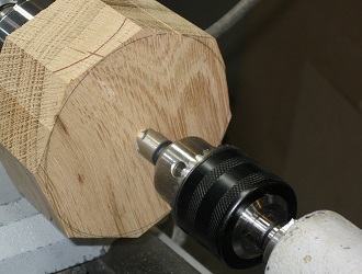![]() ![]() 7 — (Somewhat optional) I prefer to bring up the tailstock (with a live center) to provide additional support while the blank is turned to round. (Admittedly, it has to be taken away as soon as that is done and work on the bottom of the bowl begins.) Usually I am content to just let the point of the live center dig in and press the blank back against the chuck. I figure that if something bad happens, the blank is more likely to stay on the lathe and I'll only have the gouge (or its fragments) to duck. But for a "difficult" wood, such as oak (see pictures at right), I'll go the extra mile and make sure the ring of the center also engages. To do this, I have to bore a hole for the point to sink into. This starts with a shallow drilled hole and is followed up with a countersink bit (as shown in the pictures). We're smack in the middle of the bottom of the bowl, here, so we need to be careful. If the hole is no deeper than absolutely necessary, it will disappear when we cut the mortise to reverse the bowl in the chuck (see later steps). Otherwise, we'll have to shave away the bottom of the bowl just to get rid of this hole. So, as I said, I only go to this extreme for hard woods or otherwise difficult blanks. Usually, I just dig the point in hard and ignore the ring.