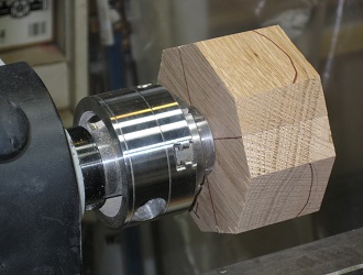 ![]() ![]() 6 — Mount the blank on the lathe (you may have done this to draw the circumference and then unmounted it). For safety, disconnect power to the lathe. Mount the chuck on the lathe and your worm screw in the chuck (video 1, 2:41). Put the drilled hole over the worm screw and screw the blank onto the chuck until the top face is tight against the jaws. I wear a glove to avoid splinters. For a very shallow bowl, you can reduce the depth of the drilled hole by including a spacer between the blank and the jaws, but make sure that it's firmly held in place and doesn't fly off when you begin to work it.